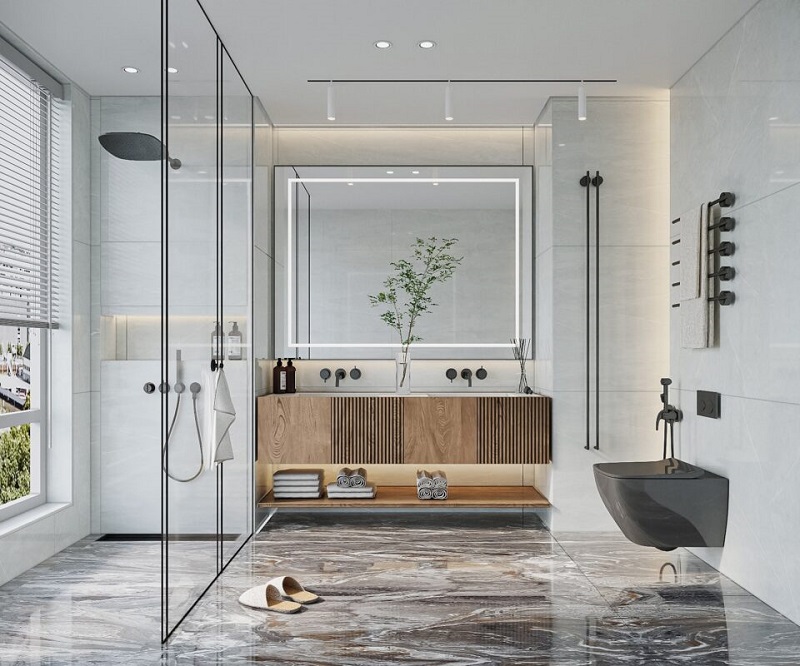 Những phòng tắm lớn, thiết kế hiện đại tuyệt đối không nên bỏ qua gạch men trắng hoặc gạch họa tiết vân đá tự nhiên. Sắc trắng luôn tạo cảm giác sạch sẽ, gọn gàng.